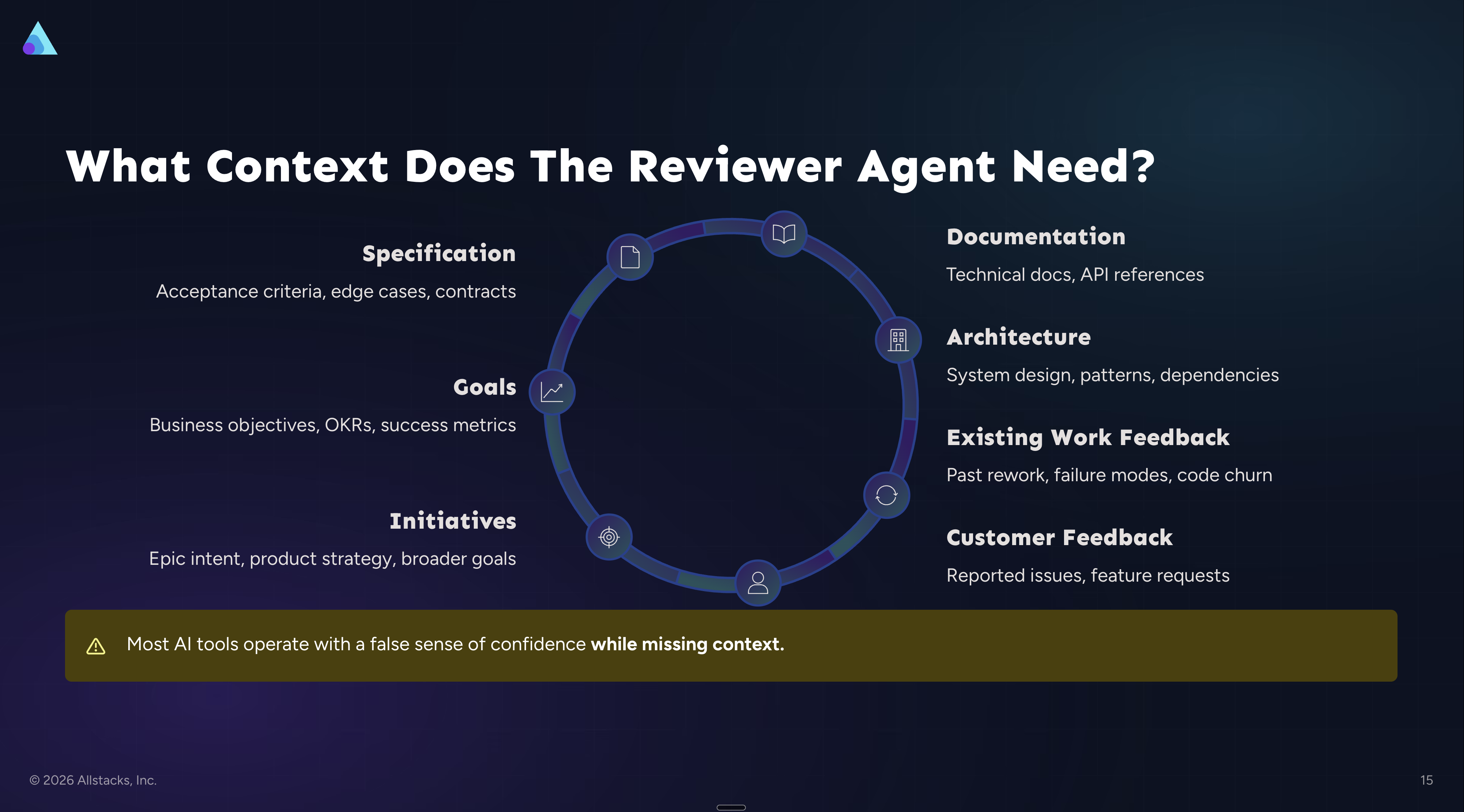 The Allstacks Spec Readiness Agent reads your tickets against the full context layers a senior engineer would use in review and grades whether a body of work is ready for an AI coding agent to execute. It operates in three modes — epics, sprints, and individual tickets — and surfaces readiness gaps before the coding agent picks up the work. The goal is to move the quality gate upstream of code generation, so agents are building from specs with enough context to produce correct output the first time.