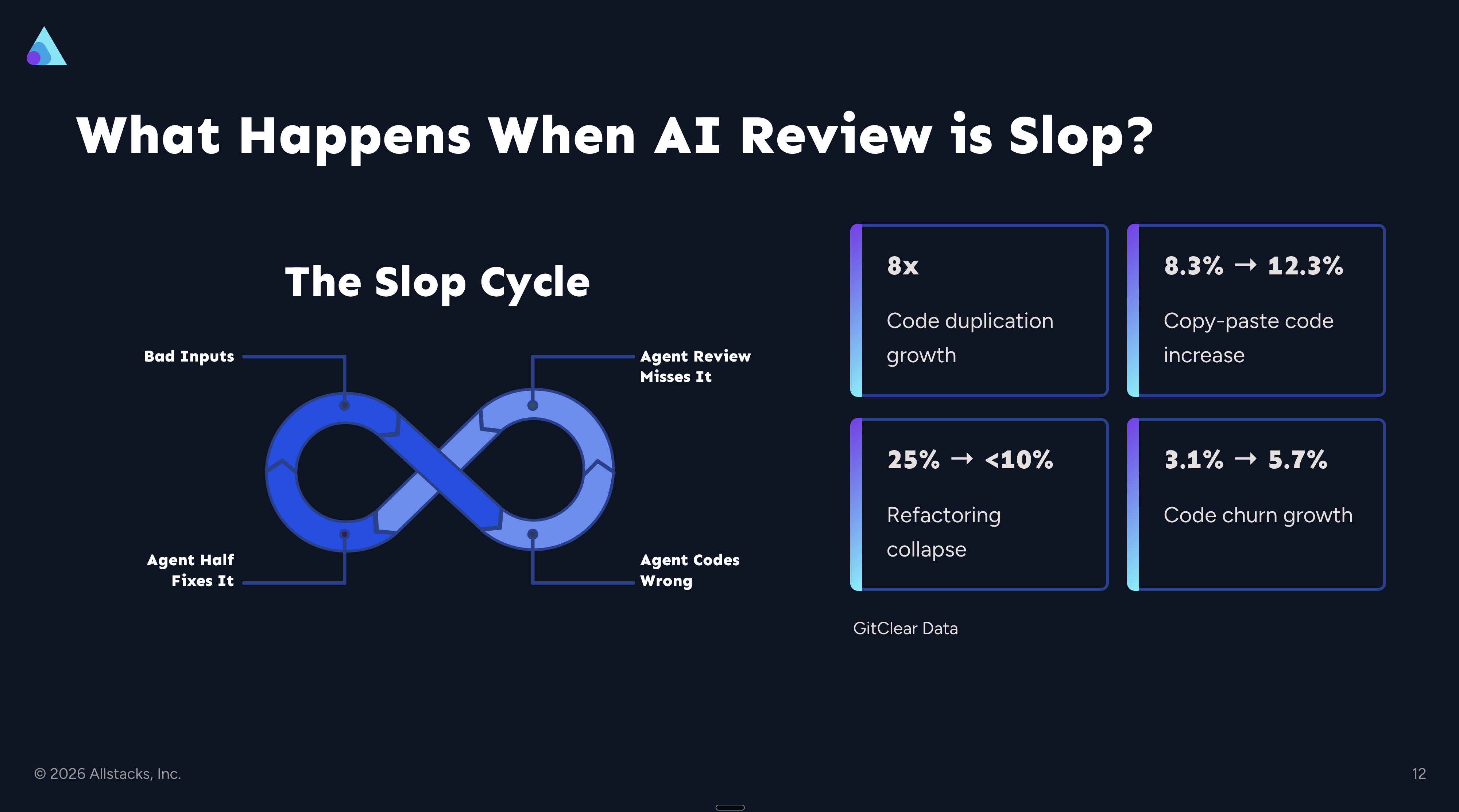 An agent grading a ticket against one of those seven layers will miss the other six every time. The gap shows up as duplicated code (copy-paste volume up roughly 8x per GitClear), refactoring collapsing, and a codebase that rots faster than it ships.